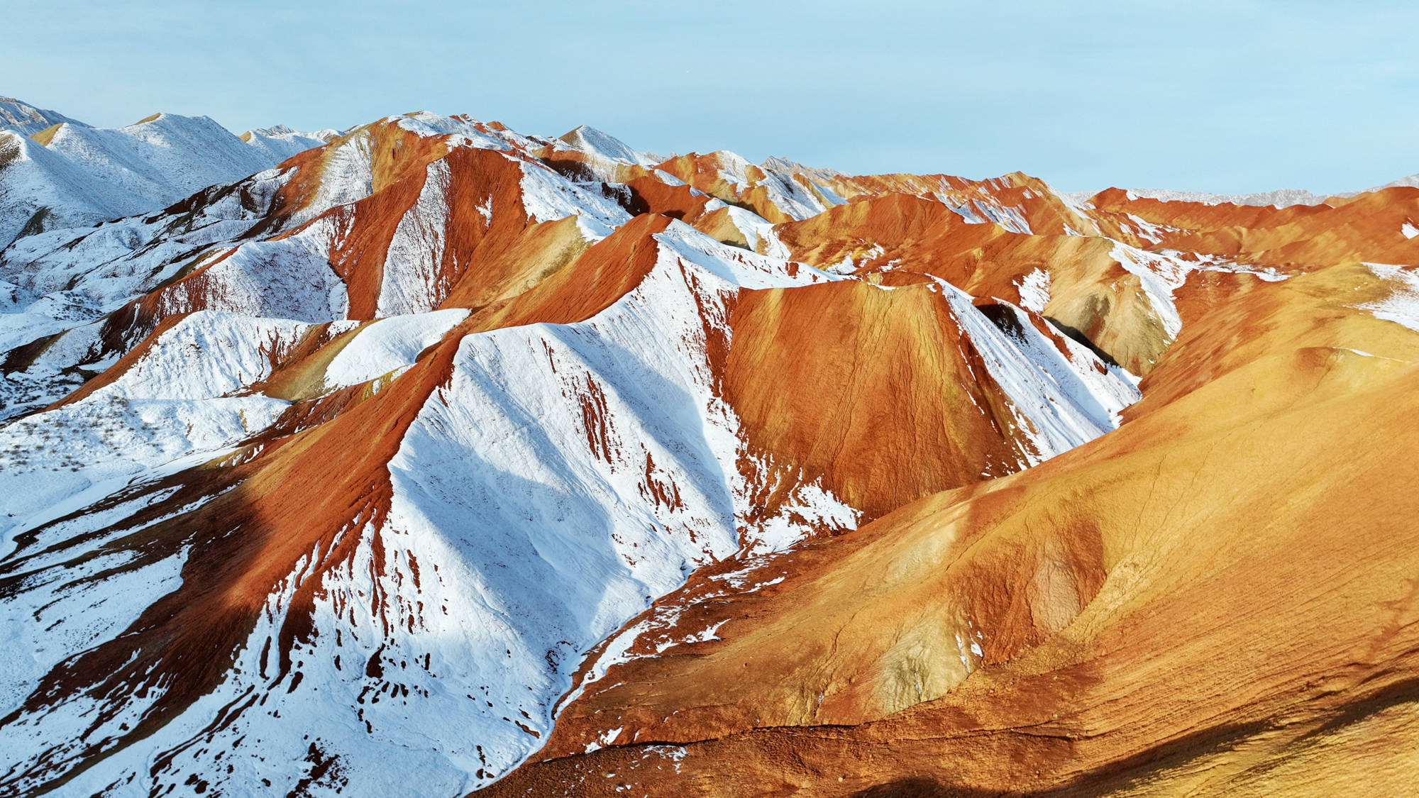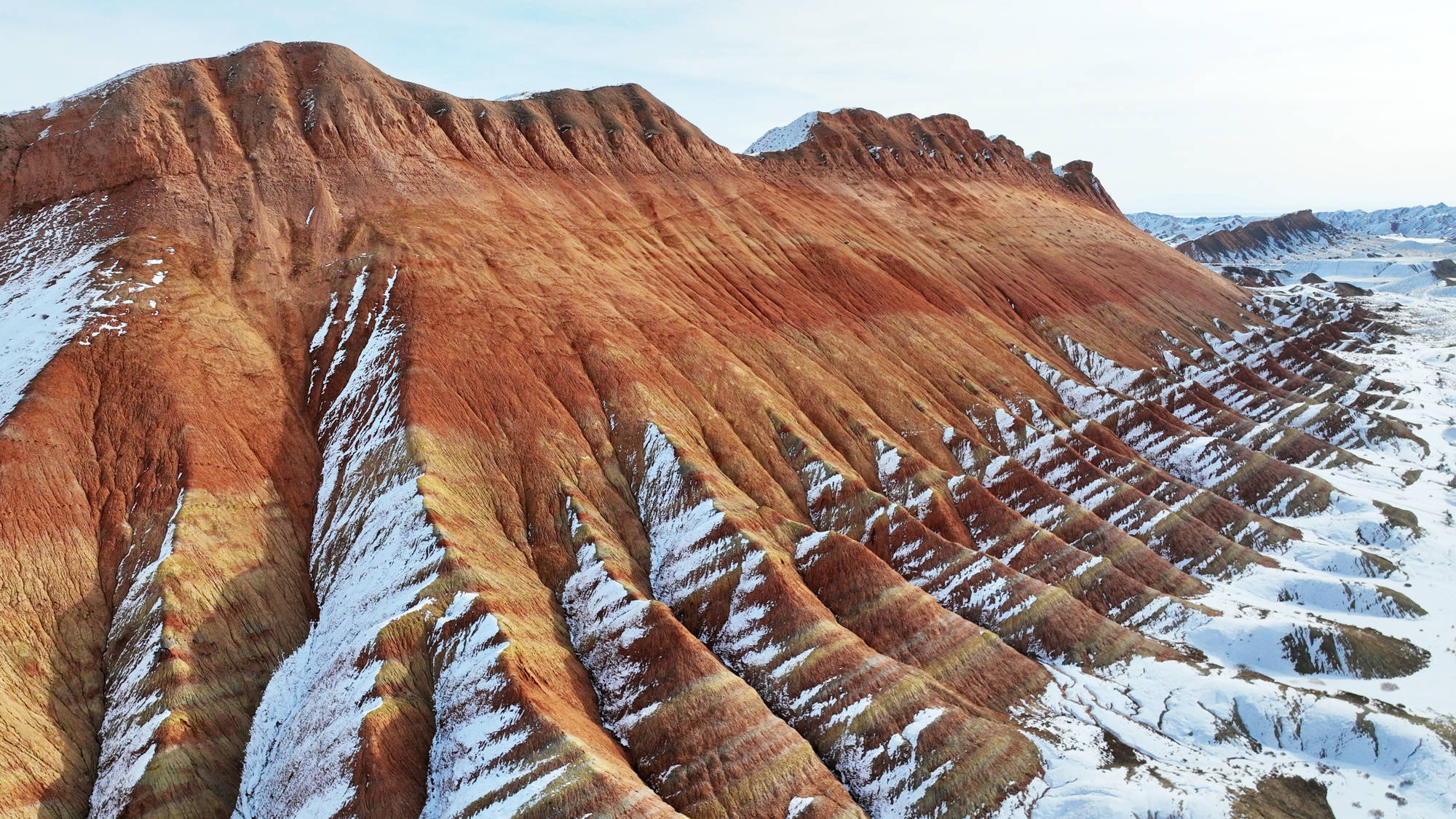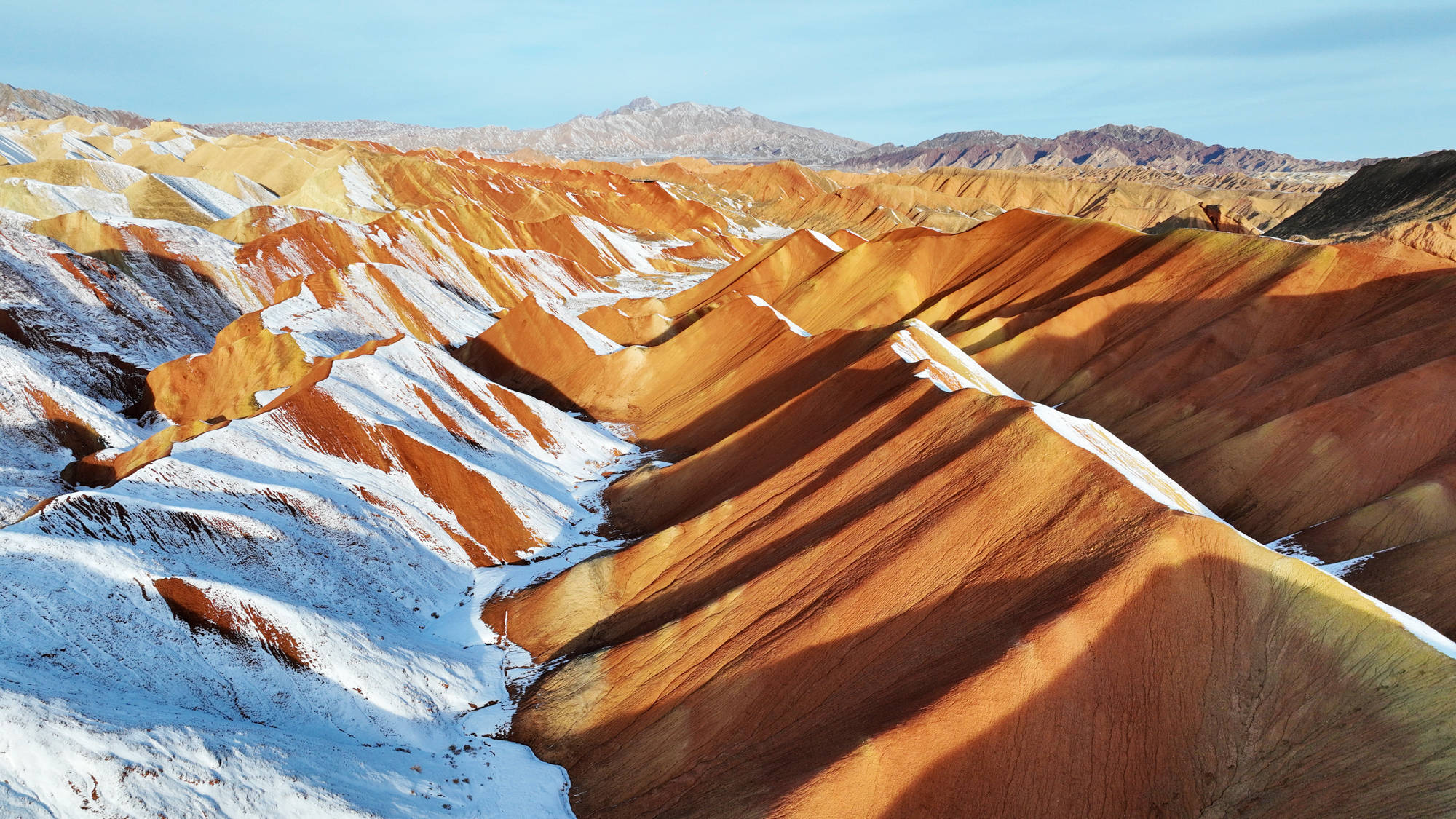 2025年12月21日,雪后初晴,在甘肃省张掖市七彩丹霞景区,白雪与丹霞交相辉映,呈现出“雪浴丹霞”美景,尽显大自然神奇魅力。
