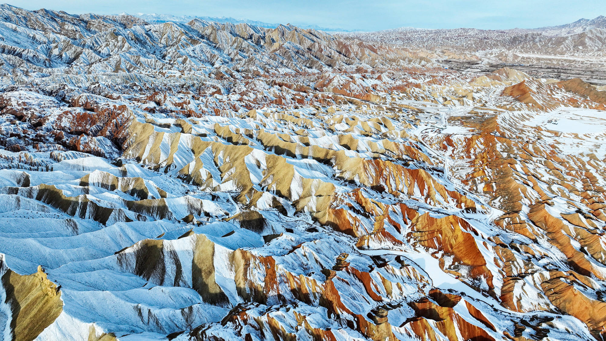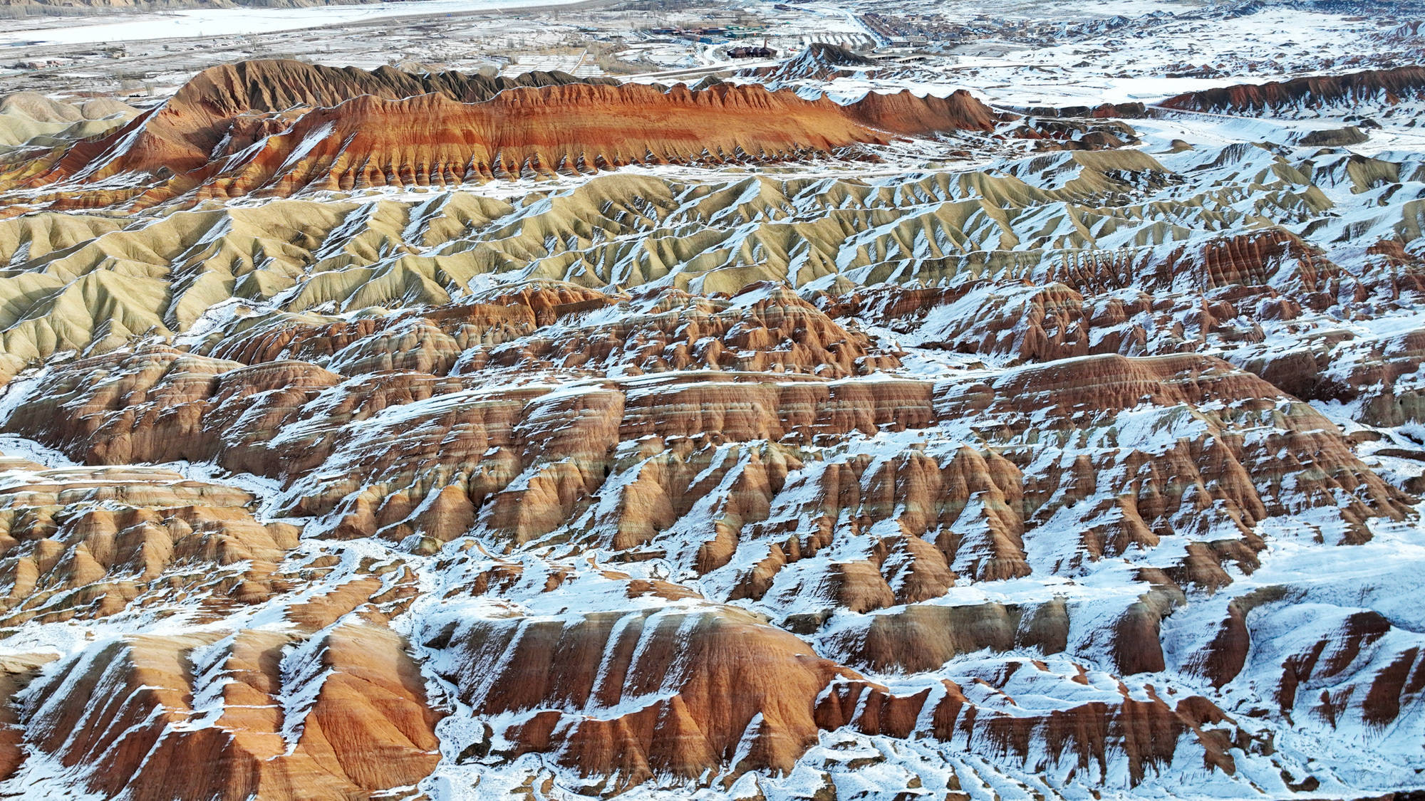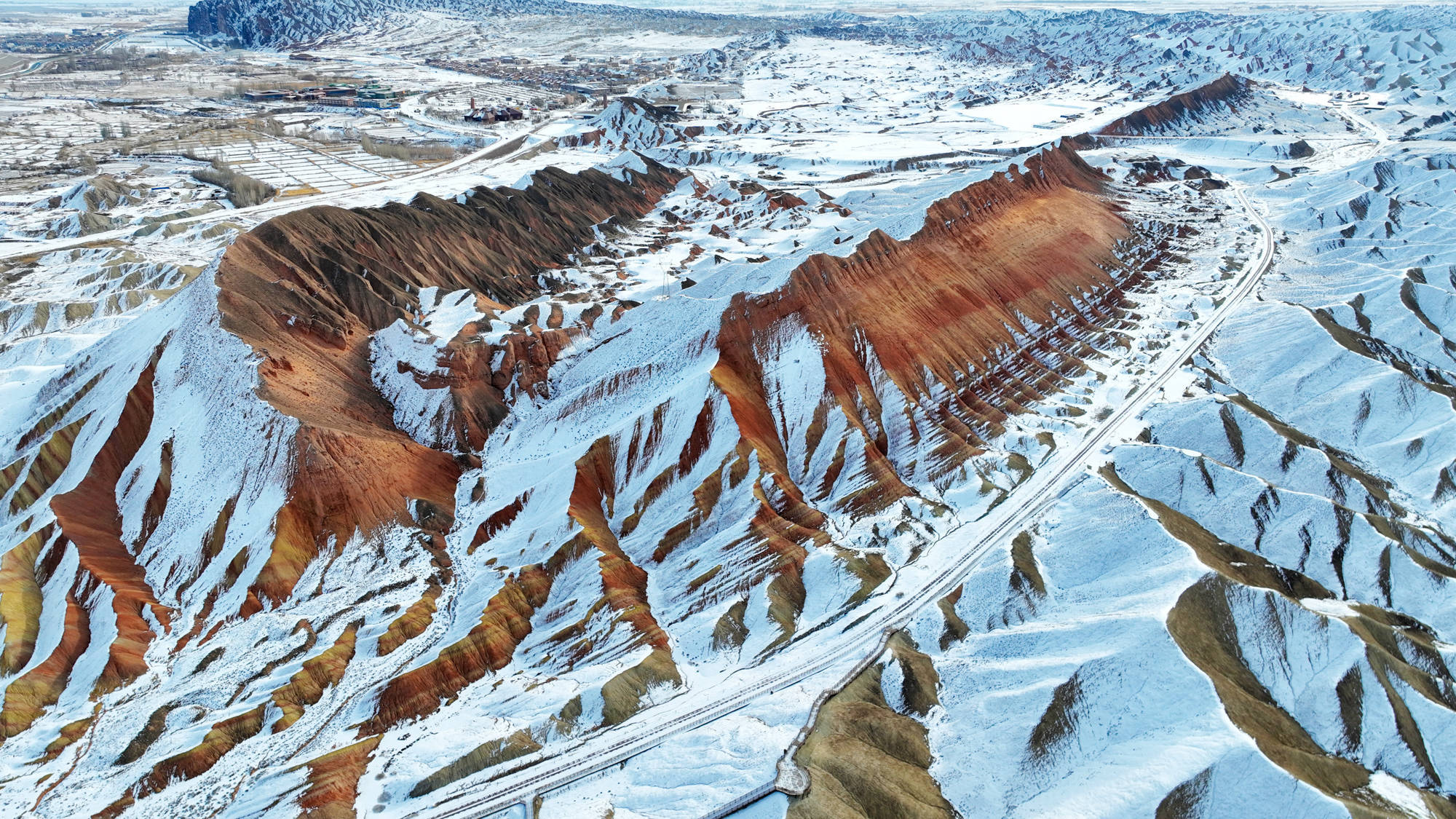 以上图片:2025年12月21日,甘肃省张掖市七彩丹霞景区白雪皑皑,蔚为壮观。(无人机照片)CICPHOTO/成林 摄
